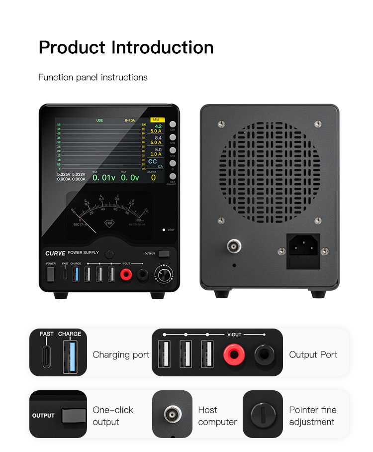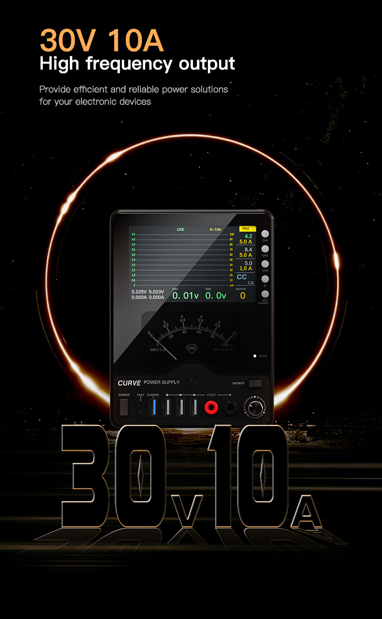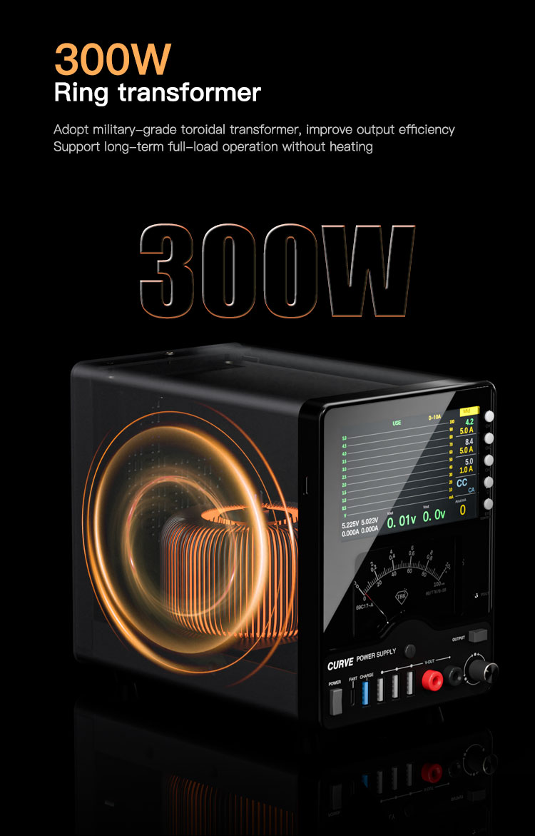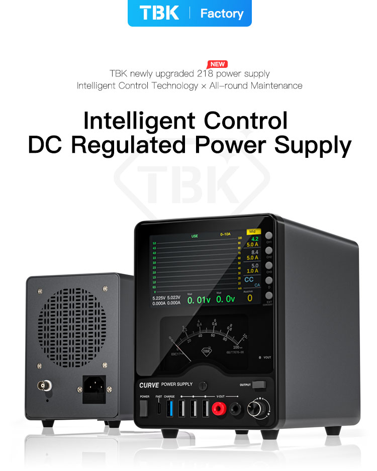 This unit features a unique dual-display system: a large 4.3-inch color LCD screen and a classic analog pointer meter. The screen provides clear digital readouts and can also display real-time voltage and current waveforms, helping you visualize power consumption dynamically. The high-sensitivity analog meter offers three switchable ranges for precise current measurement. Powered by a robust 300W toroidal transformer, the TBK-218 ensures efficient and stable performance even under heavy loads. Additional functions like a simple oscilloscope, short-circuit repair mode, and multiple front-facing USB ports make it a versatile all-in-one tool for your workbench.