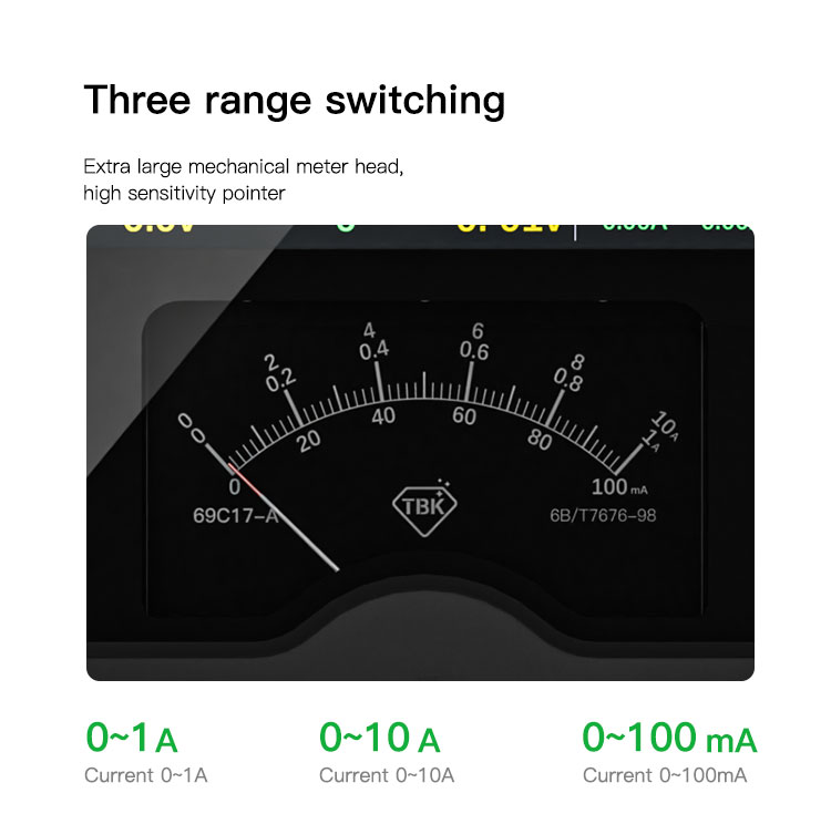 Three-Range Analog Meter: The physical pointer meter can be switched between 0-100mA, 0-1A, and 0-10A ranges for detailed current monitoring.